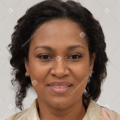 Joyful black adult female with medium  brown hair and brown eyes