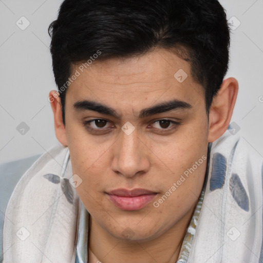 Joyful latino young-adult male with short  brown hair and brown eyes