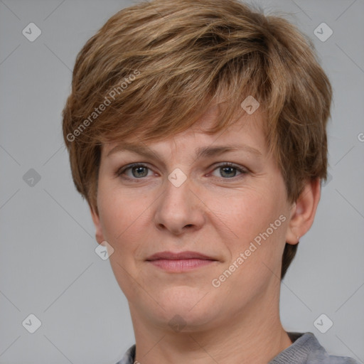 Joyful white young-adult female with medium  brown hair and grey eyes