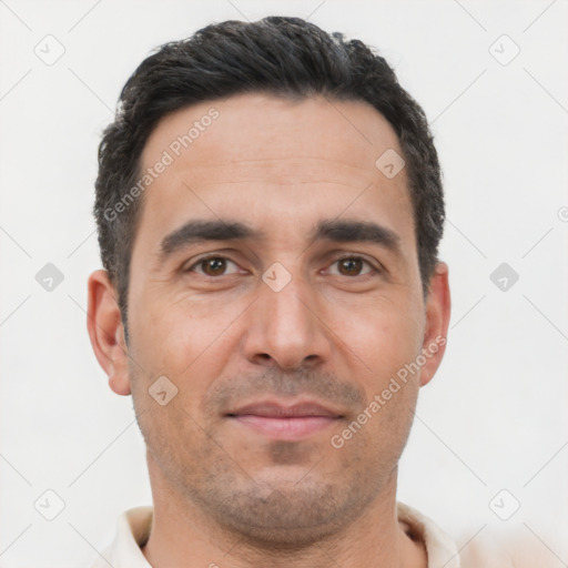 Neutral white adult male with short  black hair and brown eyes