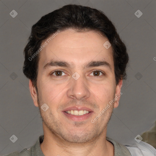 Joyful white young-adult male with short  brown hair and brown eyes