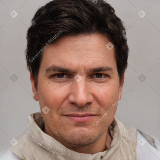 Joyful white adult male with short brown hair and brown eyes