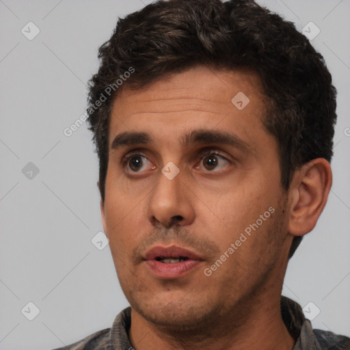Neutral white adult male with short  black hair and brown eyes
